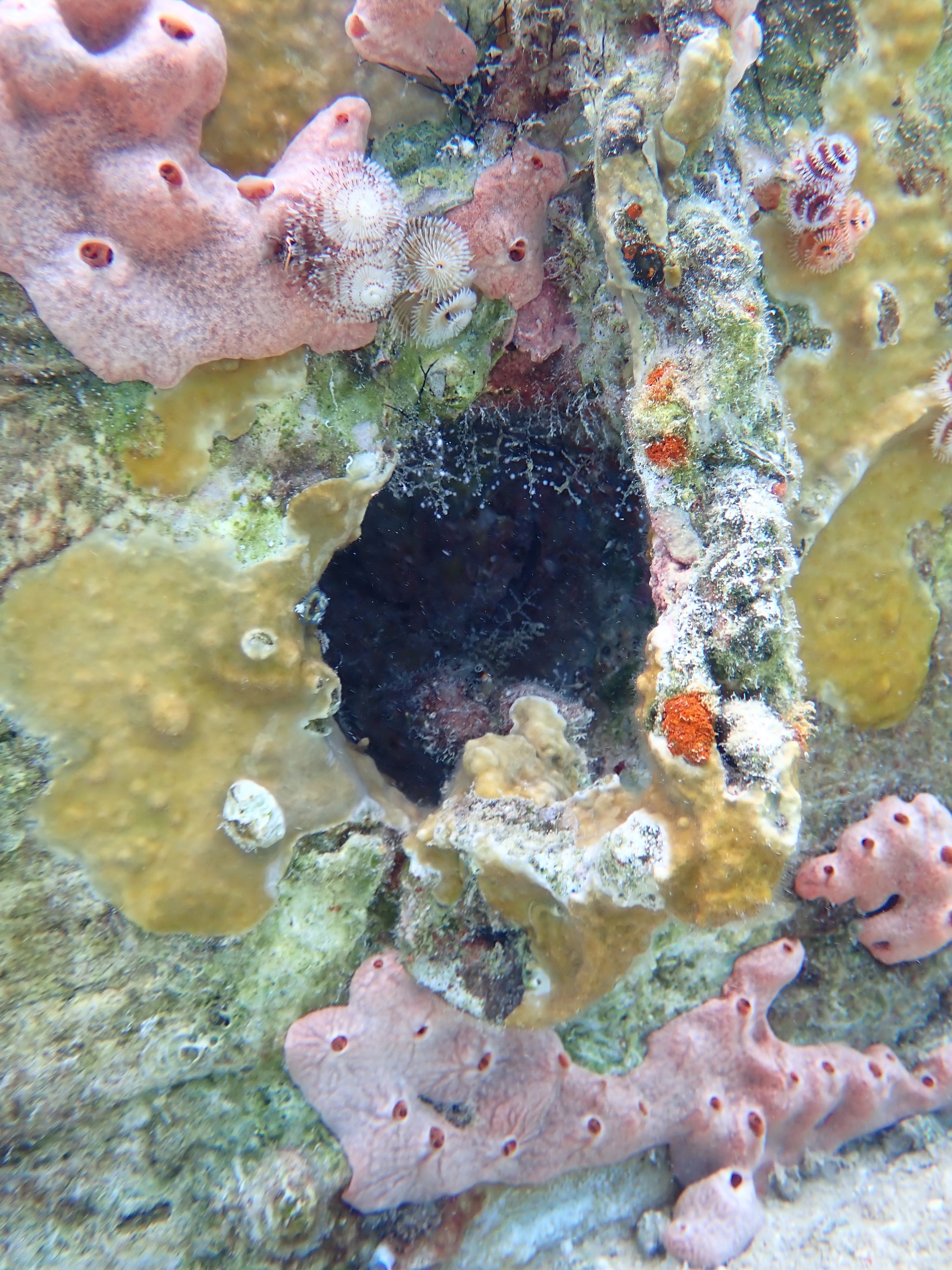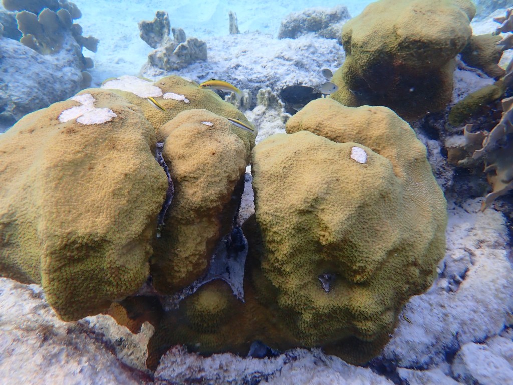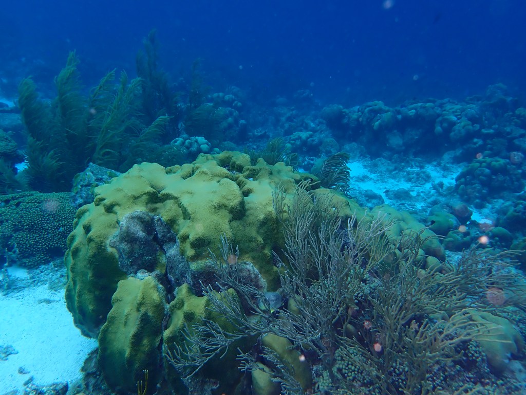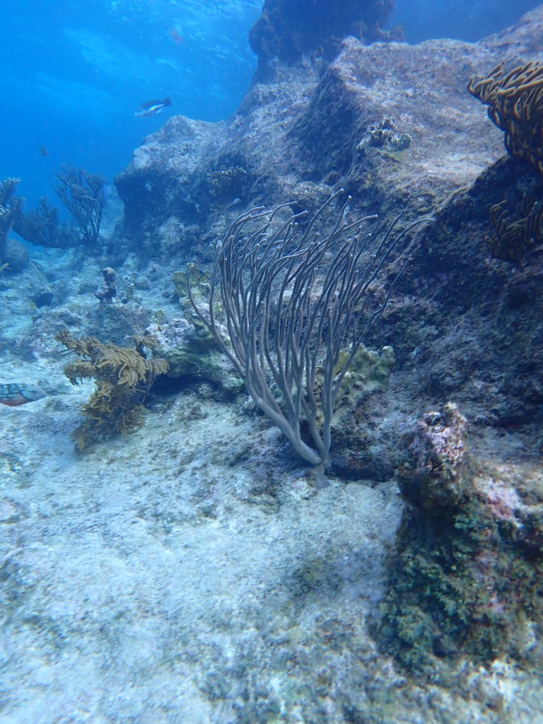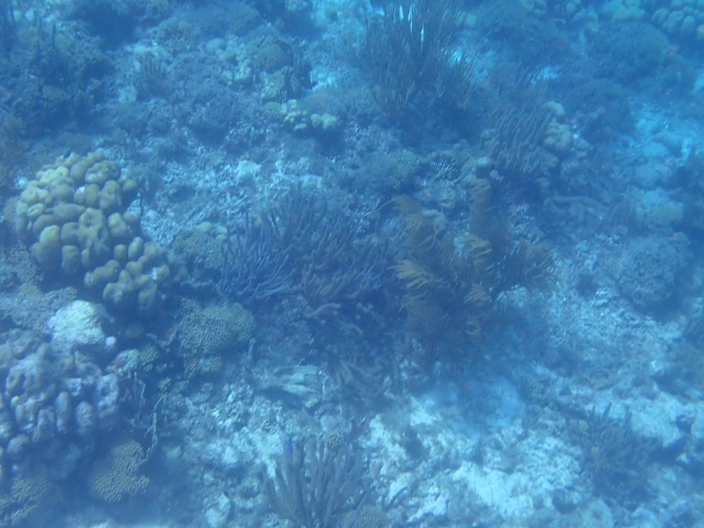 Oil Slick is really too deep for enjoyable snorkeling, but had a lovely bottom with large boulder corals and giant sea plumes. In many of the pictures you can see how the coral is struggling with disease, no longer a uniform color. Due to the wave action, there’s lots of particles blown up in the water even though there is relatively little exposed sandy bottom.