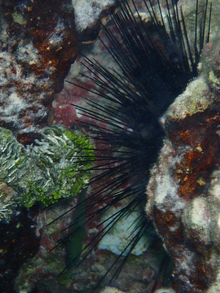 First stop for me is always Andrea I, historically one of my favorite areas to snorkel on Bonaire. Unfortunately, Stony Coral disease has continued to make inroads on the larger boulders and to my surprise, the fire coral as well. When I first arrived on Bonaire, I was surprised by how much fire coral there was. On my last visit, it seemed to be remaining healthy, but on this one, I saw definite die-off along with bleaching heat-stress. I think there is significantly more algae growth. It still has a lot of parrotfish and damselfish which love to eat algae. Sea urchins also seem to be making a comeback, which is probably good as they are algae eaters as well.