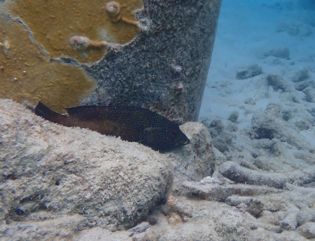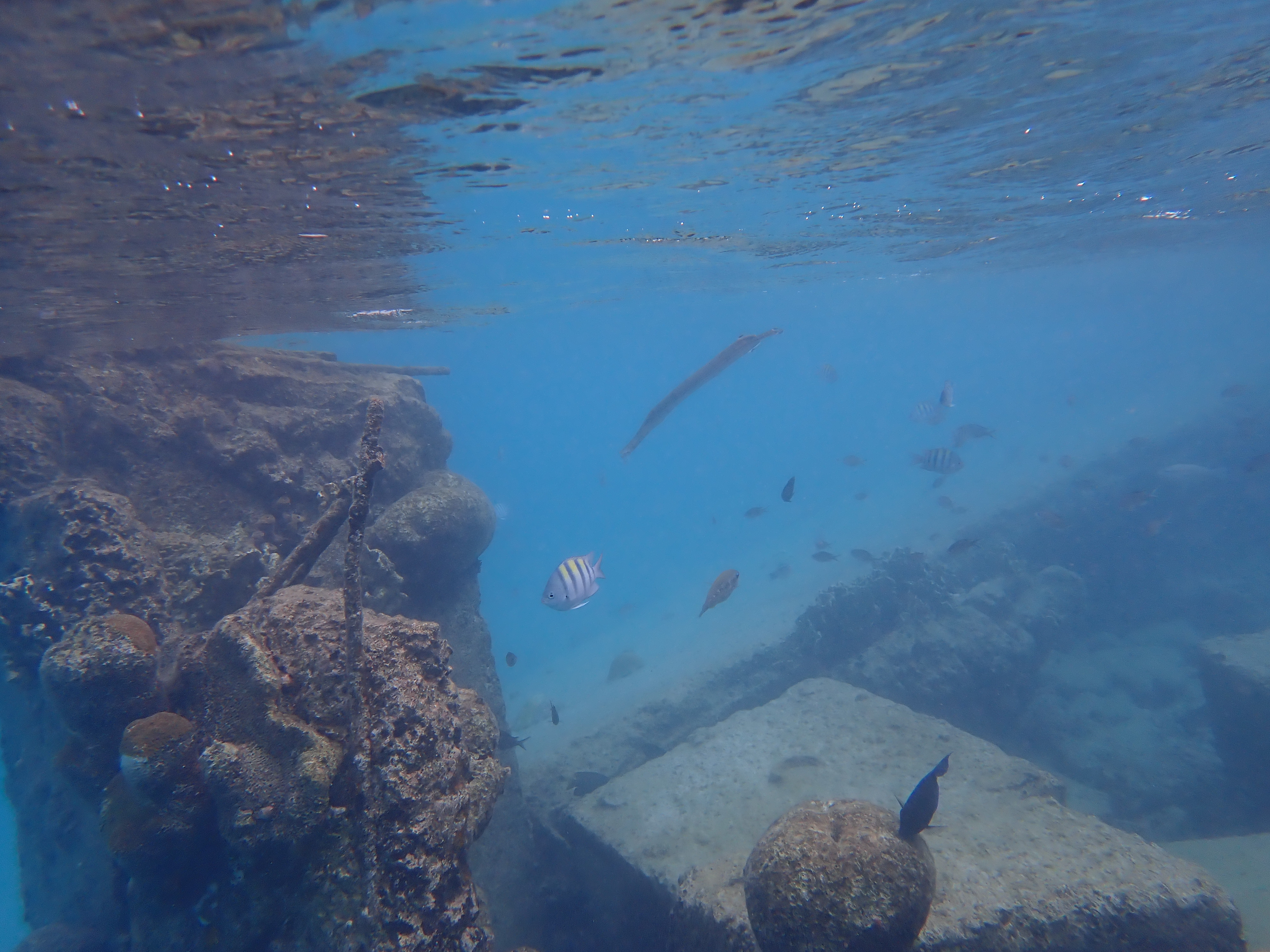 Since I was in town, I went to Isidel Beach Park, a new park with a disability ramp into the water to check it out. I think the area in front used to be called Bari Reef, which also extends to the front of Chogogo Beach Resort. Chogogo is a monstrous money-making resort that did not do just stewardship towards beach construction. They trucked in tons of sand for a sandy beach, and promptly lost it to the first storm that went through. The water quality shows here, with poor visibility in photos with any distance. However, there’s an artificial reef to the left of the walking ramp that attracts a nice variety of fish. I’ve noticed structures of any sort provide a basis for corals, sponges and algae to cling to, which in turn attracts more fish.