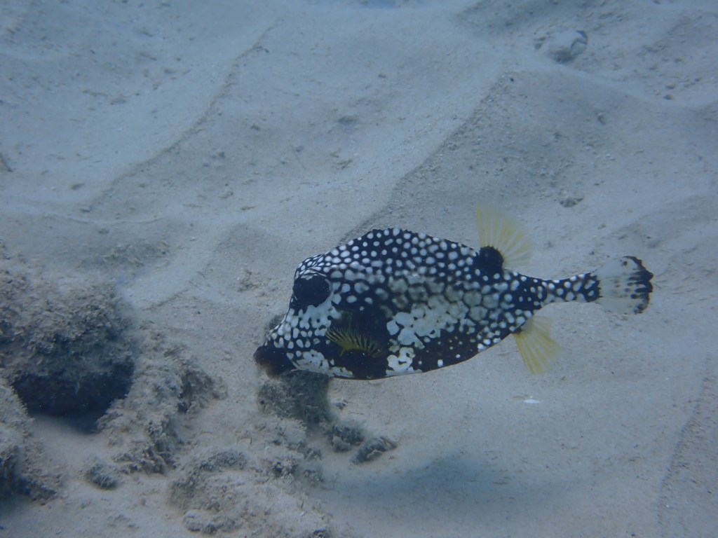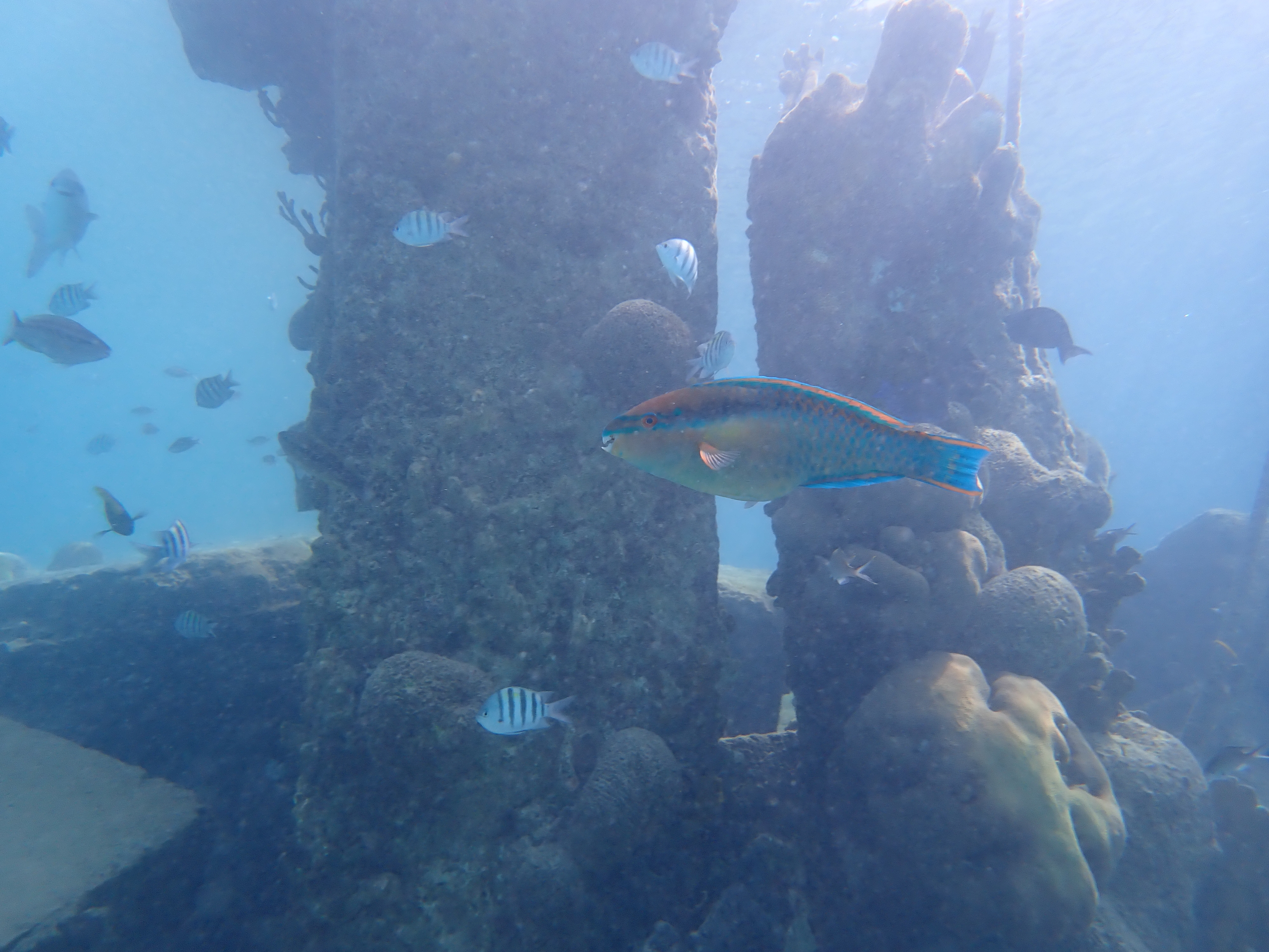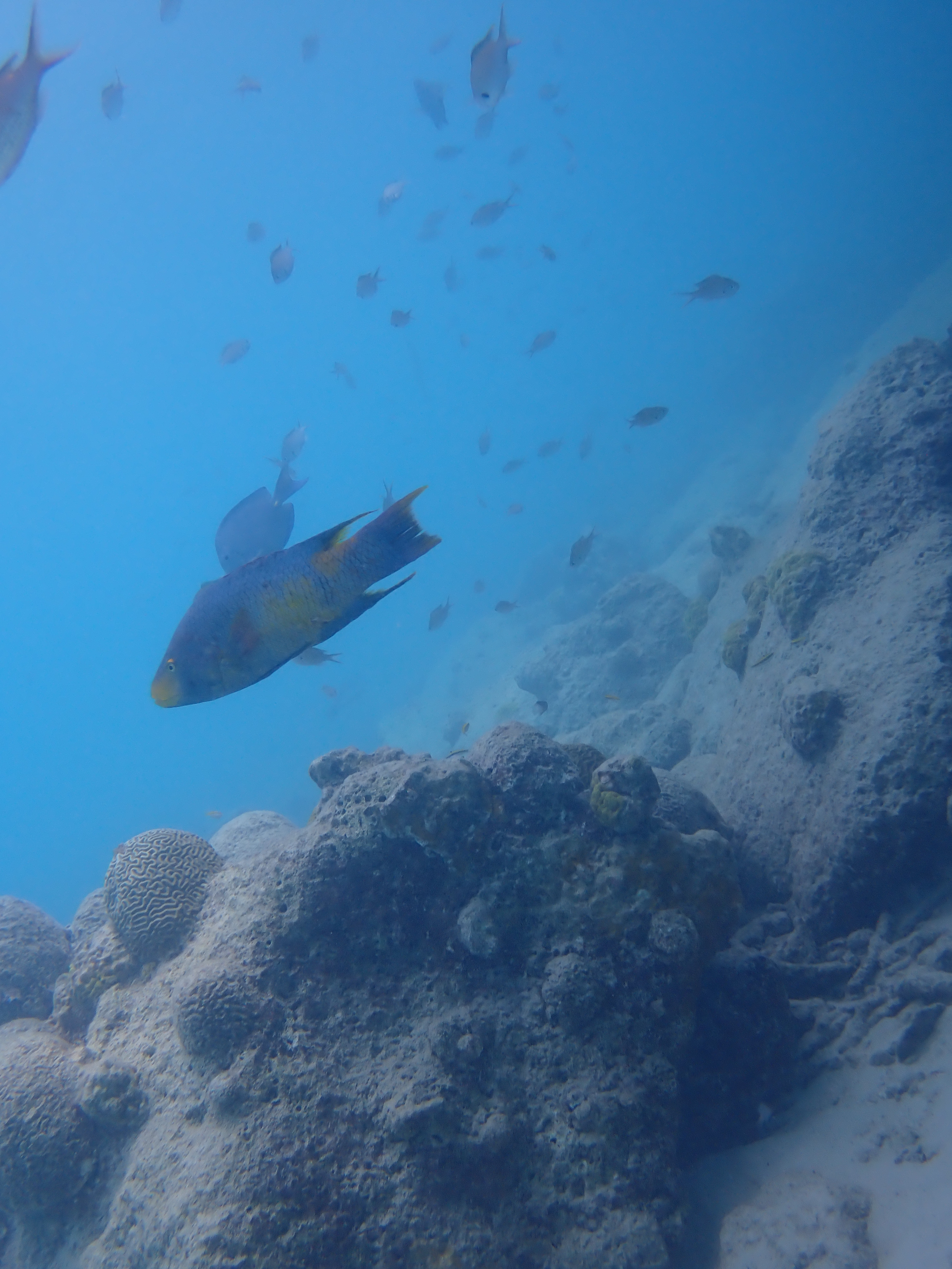 There was decent fish diversity, with a number of different parrotfish–yellowtail, redtail, Queen, princess, and rainbow–damsels, a few spotted trunkfish and orange spotted filefish, lots of tangs, sergeants, grunts, and goatfish, a few yellowfin mojarra and bar jacks, and even a pair of banded butterflies, a Bermuda chub and a scorpionfish.